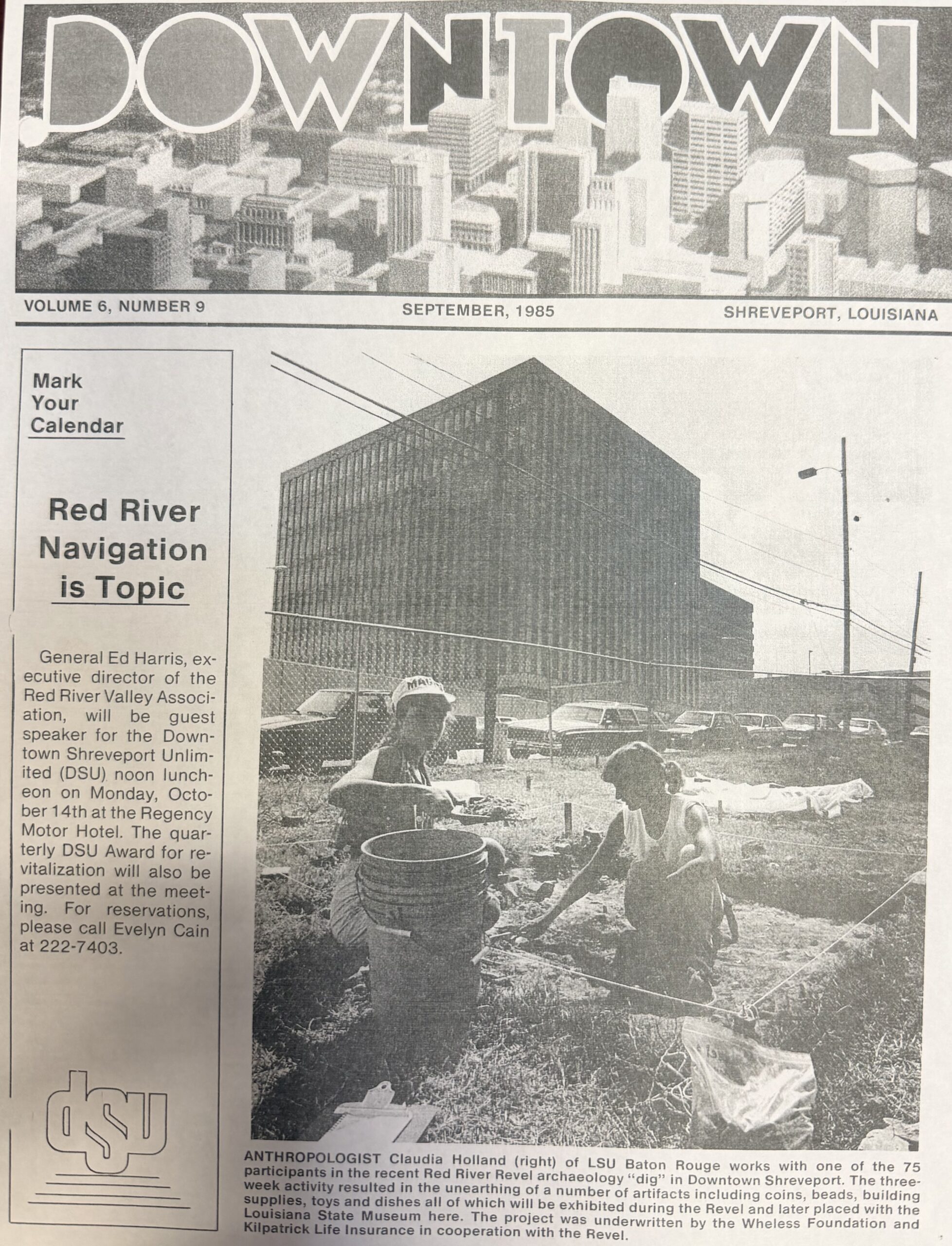 Anthropologist Claudia Holland (right) of LSU Baton Rouge works with a volunteer in a Red River Revel archaeology dig in downtown Shreveport. The activity took place over a 3-week period and resulted in the unearthing of a number of artifacts including coins, beads, building supplies, toys and dishes. The artifacts were displayed during the 1985 Revel.