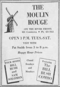 Note: The Moulin Rouge was a staple of downtown Shreveport’s night life. The popular nightclub was located at 624 Commerce Street and owned and operated by the late Bill Bush, a local musician and former City Council member (1971-1990). The club was know for its live music.