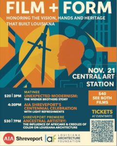 AIA Shreveport and the Louisiana Architecture Foundation (LAF) will co-host a day-long celebration of the AIA Shreveport’s 100th anniversary and a screening of two widely acclaimed films by Louisiana Architecture: Unexpected Modernism: The Wiener Brothers Story, co-produced by Shreveport’s own Gregory Kallenberg/Rational Middle Media; and multiple award-winning Ancestral Artistry: The Influence of Africans & Creoles of Color on Louisiana Architecture, co-produced by Bossier City native Allison Bohl DeHart with Lafayette-based Makemade. Co-producers Peter DeHart, co-directors/writers Conni Castille & Charles Richard.