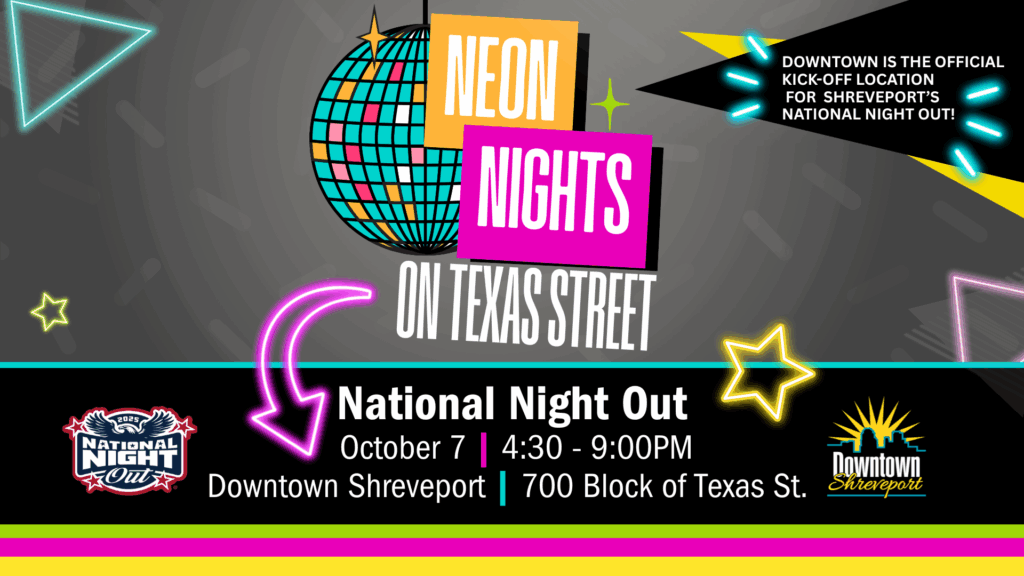 National Night Out is more than a party, it’s a chance to celebrate what makes Downtown Shreveport special. This is where people live, work, create, and connect. Neon Nights is about bringing everyone together to honor the center of our city and the community that calls it home.