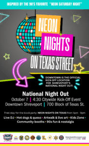 Neon Nights on Texas – National Night Out in Downtown Shreveport We’re turning up the glow in Downtown Shreveport with Neon Nights on Texas, a throwback tribute to the beloved 90’s Neon Saturday Night! Break out your brightest gear, show off those classic 90’s looks, and come ready to party downtown style!