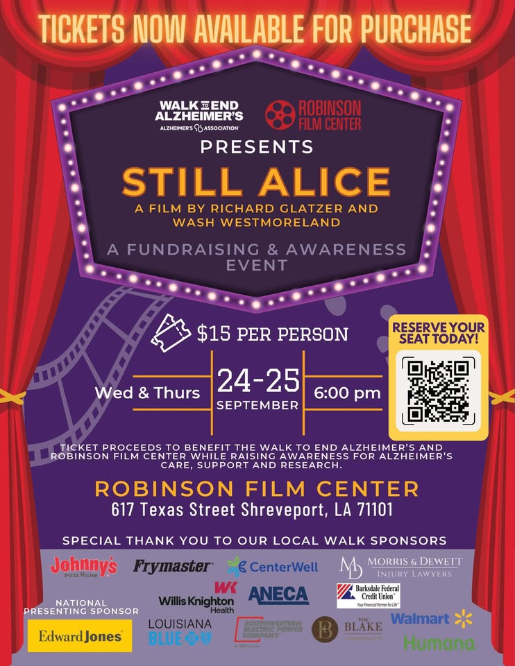 Join The Walk to End Alzheimer’s for a special fundraising and awareness event at the movies! Catch Richard Glatzer and Wash Westmoreland’s STILL ALICE on the big screen while supporting a great cause. Ticket proceeds to benefit The Walk to End Alzheimer’s and Robinson Film Center while raising awareness for Alzheimer’s care, support, and research.
